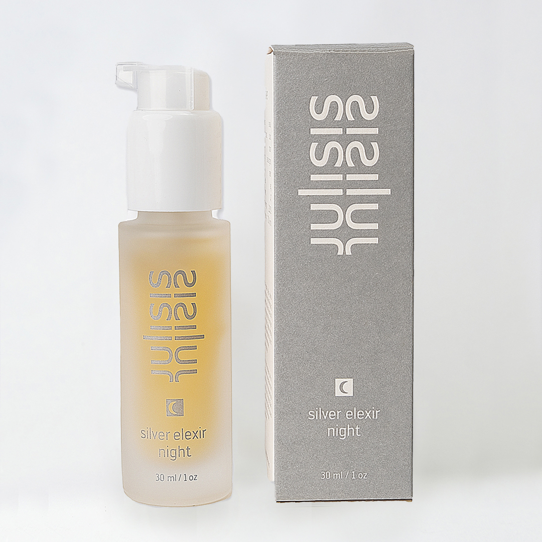 JULISIS silver elixir night uses essences from precious metals, gemstones, and natural botanical ingredients from purely organic cultivation. Skin cell regeneration mainly takes place at night. This unique formulation with jlse® [JULISIS liquid silver essence©] intensifies the detoxification process, soothes the skin, and refines the complexion. The skin retains its natural elasticity and resilience. Allergy tested. Natural. Pure. 100%